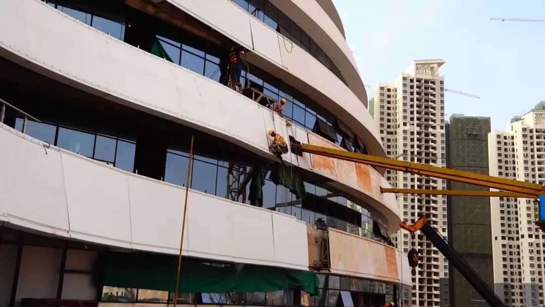 青龍公司作為國內(nèi)GRC領(lǐng)域的知名企業(yè),承接了新媒體中心三座主體結(jié)構(gòu)的雙曲面外墻板項目。由于所有的面板沒有一片完全相同,不僅要經(jīng)受高空風(fēng)雨的侵蝕,相鄰兩塊更要緊密榫合,天衣無縫,并在整體上形成流線性美感,因此需要制作大量的模具,工程極為繁瑣。但青龍GRC團(tuán)隊克服重重困難,從圖紙深化設(shè)計、彩色GRC選材、造型產(chǎn)品生產(chǎn)到安裝施工等一系列工序中都做到極致,讓甲方和監(jiān)理都非常滿意。