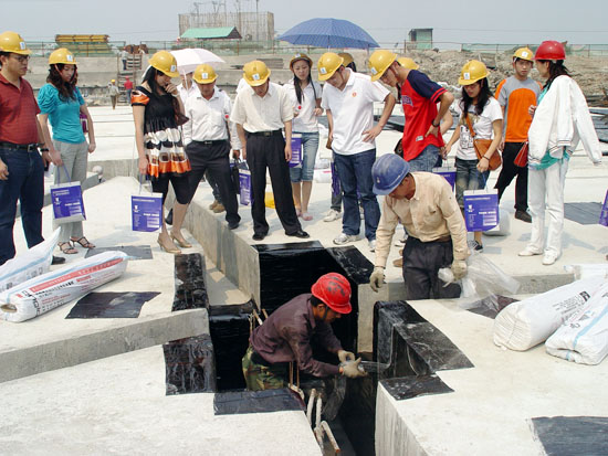 青龍公司自粘卷材預鋪反粘施工工藝的大量應用,徹底顛覆了傳統(tǒng)材料直接施工于墊層的工藝。如番禺祈福新村,中山新中醫(yī)院的地下室防水工程,皆是采用預鋪反粘。在中醫(yī)院新址地下室施工過程中,我公司先后組織了開發(fā)商、設計師、建筑單位等大批人員進行現(xiàn)場觀摩學習,了解這一先進工藝,促進預鋪反粘的進一步推廣。