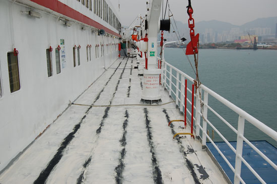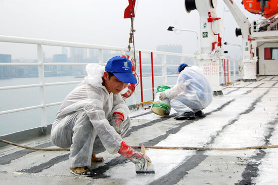 接到該訂單后,3月21日,公司派一支素質(zhì)過硬的施工隊伍奔赴香港開始作業(yè),由于期間香港天氣變化反復,時常下雨;待基面底漆頑固,銹跡斑斑難以清理,均為凹凸不平的麻面;再加上該郵輪白天需正常營業(yè),施工多只能在晚上進行,等等一系列因素都給施工帶來了嚴峻考驗。青龍公司歷來重視每一筆訂,注重每一個細節(jié),董事長宋敦清先生得知后,親自前往,與公司總工徐新生論證了一個較好方案后開始指導施工,考慮到施工部位特殊,長期在海面上風吹日曬,之后選用了其耐候、耐酸堿、耐紫外線、耐老化、耐霉菌、耐鹽霧、耐臭氧、耐溶劑、耐磨、耐沖擊和耐油性等綜合性能優(yōu)異的CQ101防水密封涂料。先用特殊纖維填充10mm高度,再在上面找平3mm厚,然后用青龍CQ101防水密封涂料自流平成膜。經(jīng)過一個星期的艱苦奮戰(zhàn),順利完成施工。