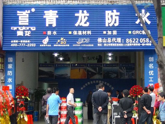 ?。翟拢慈眨殡S著喜慶的民樂,熱鬧的鑼鼓,位于佛山市南海區(qū)桂城東二大道南興裝飾城一樓A8商鋪的青龍防水佛山總代理專賣店隆重開業(yè)。經(jīng)過精心的裝修,藍底白字的“青龍防水”門牌顯得格外顯眼,而店前的花籃也為開業(yè)慶典增添了節(jié)日的氣氛。青龍建材集團董事長宋敦清、廣東省區(qū)域服務(wù)人員,以及一百多位防水業(yè)界嘉賓到場祝賀。