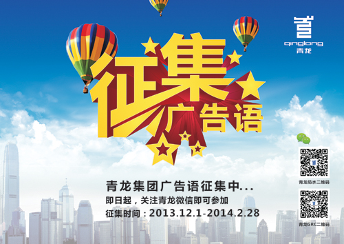 現(xiàn)為了使各地代理商、消費(fèi)者及社會公眾更加容易理解青龍集團(tuán)的環(huán)保節(jié)能、社會責(zé)任、誠實守信等文化涵義,建立青龍集團(tuán)全新品牌形象,現(xiàn)向社會各界征集集團(tuán)廣告語。歡迎社會各界踴躍參與。