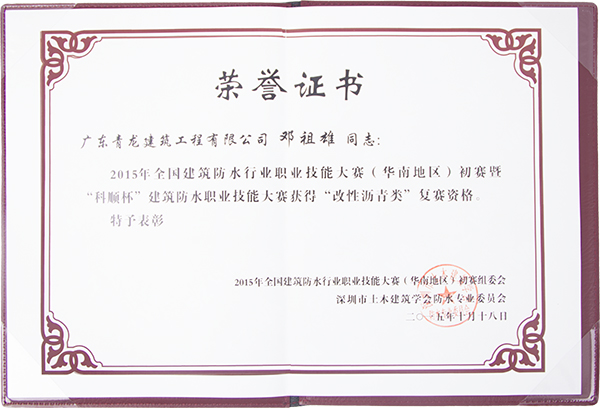 10月17日至18日,由中國建筑防水協(xié)會主辦、深圳市土木建筑學會防水專業(yè)委員會承辦的建筑防水職業(yè)技能大賽暨2015全國建筑防水行業(yè)職業(yè)技能大賽(華南地區(qū))在廣東高明舉行。來自全國的12家防水企業(yè)32位選手參加了比賽,青龍公司員工鄧祖雄先生憑借在改性瀝青和高分子防水卷材上的過硬表現(xiàn),順利晉級。