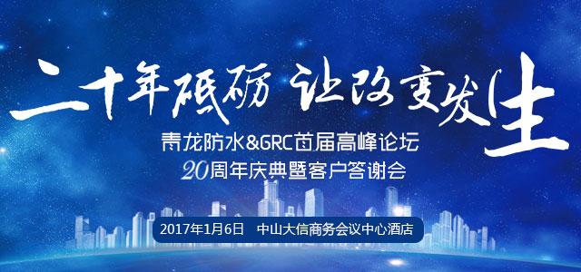 2017年1月6日,由青龍建材主辦的2017年防水&GRC高峰論壇、青龍建材20周年慶典暨客戶答謝會(huì)將于廣東中山市大信商務(wù)會(huì)議中心酒店盛大舉行,期間將邀請(qǐng)國(guó)內(nèi)外著名專家學(xué)者蒞臨參會(huì),旨在齊聚防水和GRC行業(yè)各界人事,共同探討當(dāng)前形勢(shì)下行業(yè)發(fā)展前景和中國(guó)建筑業(yè)的趨勢(shì),破解行業(yè)難題。青龍建材作為東道主和主辦方,將就公司未來(lái)發(fā)展戰(zhàn)略作出重要闡述。此次行業(yè)大咖再次齊聚一堂將會(huì)碰撞出怎樣的火花,我國(guó)防水和GRC的未來(lái)究竟該如何?青龍建材誠(chéng)邀行業(yè)同仁蒞臨參與拭目以待。