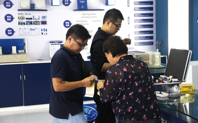 青龍博士團隊防水工程師高東偉,詳細講解了青龍339定制防水系統(tǒng)及核心理念、特色維修補漏產品,讓客人對青龍家居防水產品有了總體的了解。同時通過和市場上同類防水材料的對比,不僅增強了客人對公司防水材料、青龍品牌的信任和信心,也提升了客人防水理論水平和解決滲漏問題的實踐能力。