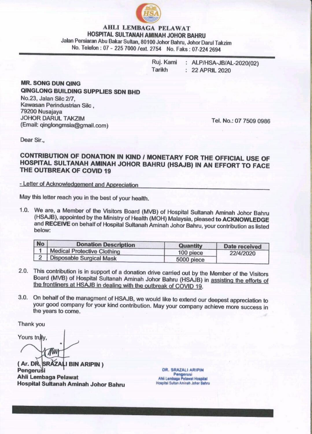近日,馬來西亞Hospital Sultanah Aminah柔佛州新山醫(yī)院在收到物資后,致函表示了真誠(chéng)的感謝,感謝青龍公司和廣大客戶的仁義之舉。