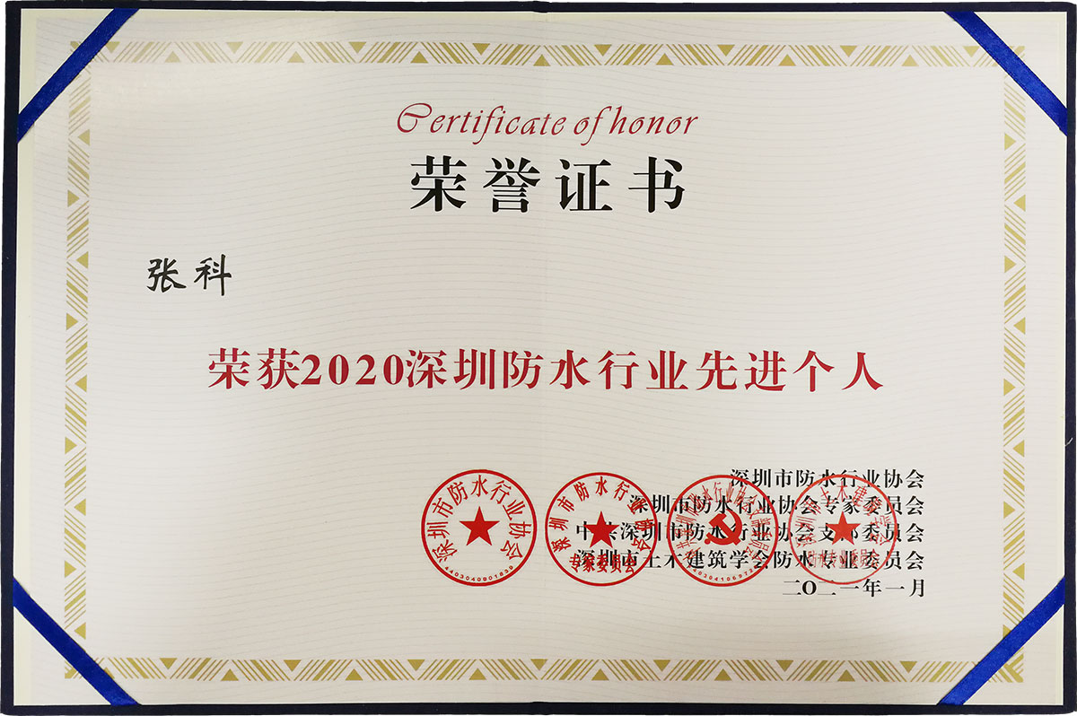 2021年1月9日,在深圳防水行業(yè)2020工作總結(jié)大會暨一屆五次會員大會(以線上視頻和線下會議方式召開)上,青龍防水補(bǔ)漏質(zhì)量總監(jiān)張科榮獲"2020深圳防水行業(yè)先進(jìn)個人"稱號。