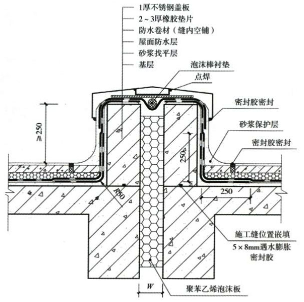 《屋面工程技術(shù)規(guī)范》 GB 50345-2012 4.11.18變形縫的防水構(gòu)造應(yīng)符合下列規(guī)定: 1.變形縫泛水處的防水層應(yīng)增設(shè)附加層,附加層在平面和立面的寬度不應(yīng)小于250mm;防水層應(yīng)鋪貼或刷至泛水墻的頂部。 2.變形縫內(nèi)應(yīng)預(yù)填保溫材料,上部應(yīng)采用防水卷材封蓋,并放置襯墊材料,再在其上干鋪一層卷材。 《屋面工程質(zhì)量驗(yàn)收規(guī)范》 GB 50207-2012 8.6.5 等高變形縫頂部宜加扣混凝土或金屬蓋板?;炷辽w板的接縫應(yīng)用密封材料封嚴(yán);金屬蓋板應(yīng)鋪釘牢固,搭接縫應(yīng)順流水方向,并應(yīng)做好防銹處理。 8.6.6 高低跨變形縫在高跨墻面上的防水卷材封蓋和金屬蓋板,應(yīng)用金屬壓條釘壓固定,并應(yīng)用密封材料封嚴(yán) |