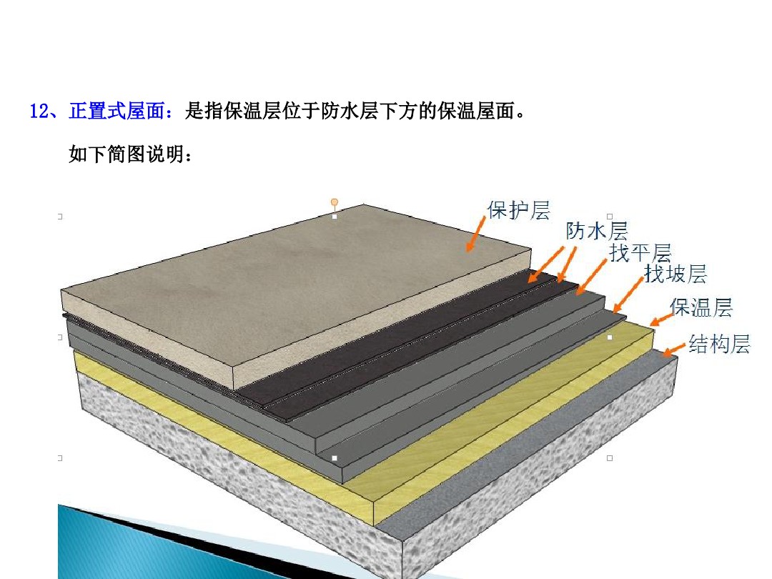 12、 正置式屋面:是指保溫層位于防水層下方的保溫屋面。