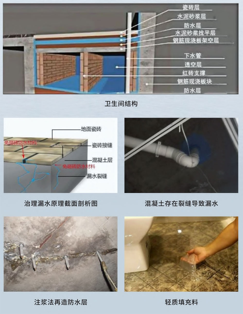 度的高分子凝膠,實(shí)現(xiàn)快速堵漏的效果。丙烯酸鹽免砸磚施工成本低、無(wú)噪音、無(wú)污染,是免砸瓷磚漏水維修優(yōu)選材料。
