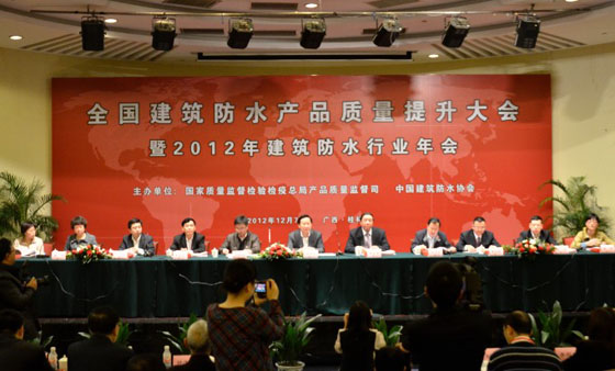 2012年12月7日,全國建筑防水產品質量提升大會在桂林召開。此次會議由國家質量監(jiān)督檢驗檢疫總局、中國建筑防水協(xié)會主辦,來自25個省(自治區(qū)、直轄市)質監(jiān)部門和生產許可管理部門的負責人,以及全國建筑防水行業(yè)骨干企業(yè)的負責人,共計450多人出席會議。