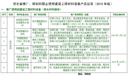 2015年版目錄是前七批“推廣、限制和淘汰使用產(chǎn)品目錄”的綜合更新版。其中,保留了仍需推廣、限制和禁止使用的建材裝備,結(jié)合近幾年河北省工程建設(shè)實(shí)際,又增補(bǔ)了新的內(nèi)容。本目錄共涉及182種產(chǎn)品,包括推廣類(lèi)87種(新列入29種),限制類(lèi)25 種(新列入12種),禁止類(lèi)70種(新列入20種),新列入的各類(lèi)產(chǎn)品,生效時(shí)間從2015年10月1日起實(shí)施。其中防水材料部份,推廣類(lèi)6項(xiàng)(新列入2項(xiàng)),限制類(lèi)1項(xiàng)(新列入1項(xiàng)),禁止類(lèi)7項(xiàng)(新列入3項(xiàng))。
