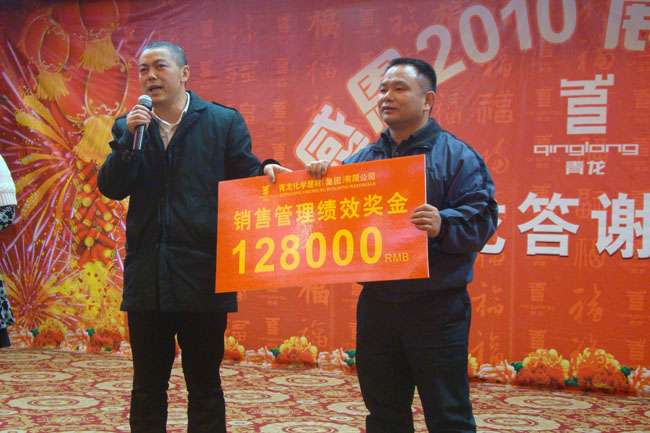 會(huì)上,青龍公司重點(diǎn)表彰了優(yōu)秀代理商代表和企業(yè)優(yōu)秀員工,其中對(duì)廣西青龍公司曾知博經(jīng)理個(gè)人銷(xiāo)售管理績(jī)效獎(jiǎng)金高達(dá)12.8萬(wàn)元,曾總發(fā)表感言說(shuō),青龍公司是個(gè)一個(gè)重信譽(yù),講誠(chéng)信,有實(shí)力的企業(yè),非常感謝青龍能給自己這樣一個(gè)實(shí)現(xiàn)自我價(jià)值的平臺(tái),并表示愿意和廣西青龍廣大同仁一起努力拼搏,2011年再創(chuàng)輝煌。
