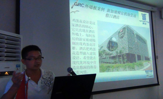 在培訓(xùn)會上,蘇小麗全面地介紹了公司生產(chǎn)的各類藝術(shù)產(chǎn)品,并對它們的生產(chǎn)工藝、安裝細(xì)節(jié)及應(yīng)該注意的問題進(jìn)行了詳細(xì)的解說。龍江則主講《GRC在現(xiàn)在工程中的應(yīng)用》,從GRC外墻板、裝飾構(gòu)件以及園林景觀方面的案例出發(fā),向與會的人員展現(xiàn)了GRC在工程中的魅力。不少參加會議的人員都表示受益匪淺,“現(xiàn)在對公司生產(chǎn)的產(chǎn)品有了一個系統(tǒng)的了解,在GRC的安裝工藝方面也增長了不少見識,相信對以后的工作會有很大的幫助?!?/DIV>