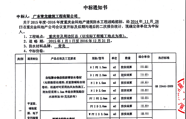 青龍集團中標金科地產(chǎn)防水工程戰(zhàn)略招標