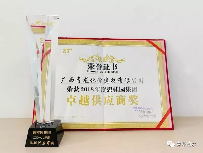 2019年3月7日下午,正值首屆"建筑防水工技能實(shí)操大賽"鏖戰(zhàn)正酣,在碧桂園集團(tuán)2018年度供應(yīng)商大會(huì)上,青龍公司憑借過(guò)硬的產(chǎn)品質(zhì)量和良好的企業(yè)服務(wù)體系,喜獲2018年度"卓越供應(yīng)商獎(jiǎng)"稱號(hào)。
