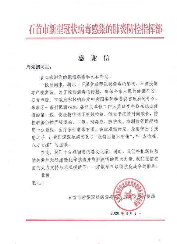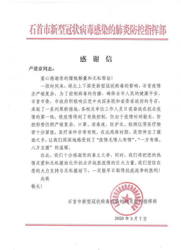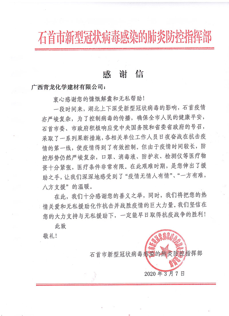 感謝信來(lái)自石首市新型冠狀病毒感染的肺炎防控指揮部,信中表示,對(duì)青龍公司及旗下代理商善義之舉表示了高度肯定和感謝,將把大家的"熱情關(guān)愛(ài)和無(wú)私援助化作抗擊并戰(zhàn)勝疫情的巨大力量,早日取得抗疫戰(zhàn)爭(zhēng)的勝利!"