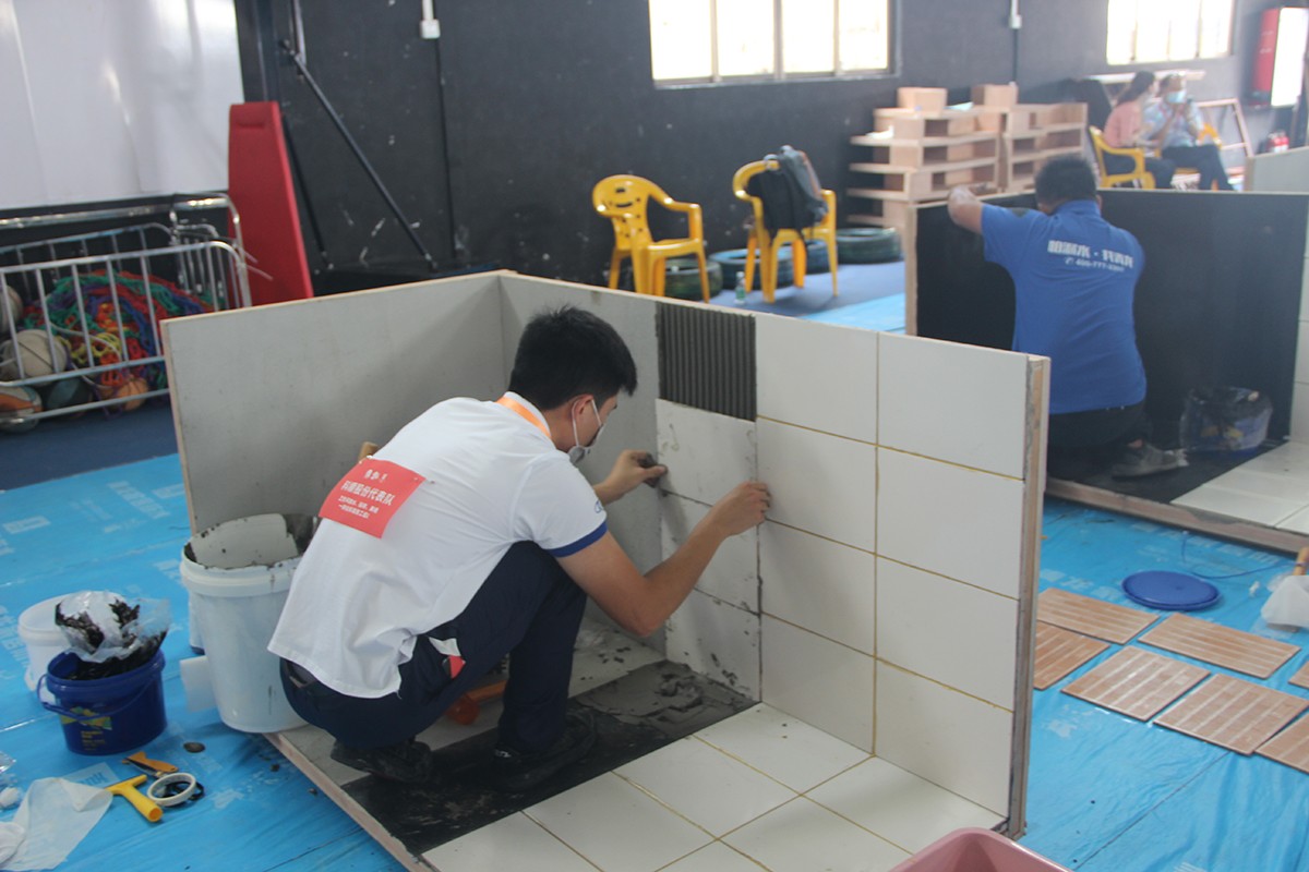 前面有一組是做衛(wèi)生間貼磚。傳統(tǒng)的認(rèn)知,大家都以為防水技能工一定是農(nóng)民工,在社會(huì)地位得不到尊重。但是在這次的比賽場(chǎng),有一個(gè)有趣的現(xiàn)象,選手越來(lái)越年輕化,你看還有很多是小鮮肉、小帥哥。所以說(shuō)防水技能工不是沒有技術(shù)含量的普通的農(nóng)民工,而是有技術(shù)含量,可以受到社會(huì)認(rèn)可的。包括今天的這次比賽,也是全國(guó)人社廳認(rèn)可的,如果成績(jī)優(yōu)異的選手,都會(huì)獲頒發(fā)證書的。所以說(shuō),我們的選手越來(lái)越年輕化,不用擔(dān)心青黃不接的問(wèn)題。