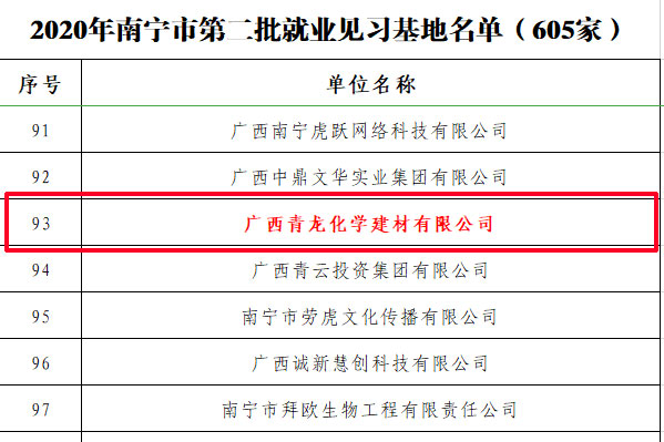 近日,從南寧市人力資源和社會(huì)保障局獲悉,為扎實(shí)推進(jìn)高校畢業(yè)生就業(yè)見習(xí)工作,經(jīng)南寧市人力資源和社會(huì)保障局審核通過,我司廣西青龍化學(xué)建材有限公司被認(rèn)為2020年~2022年南寧市就業(yè)見習(xí)基地。