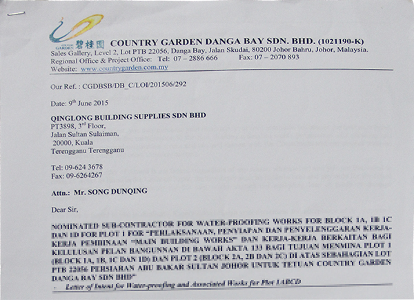青龍集團(tuán)營銷總監(jiān)賀先生表示,此次競標(biāo)碧桂園馬來西亞金海灣防水項(xiàng)目共有多家防水企業(yè),經(jīng)過激烈角逐,青龍公司與東方雨虹等四家防水企業(yè)最終脫穎而出,且青龍與東方雨虹分別獲得防水面積較大的兩個項(xiàng)目。該防水項(xiàng)目的最終落實(shí)不僅是青龍集團(tuán)開拓國際市場的又一成功案例,也表明了青龍防水材料防水效果顯著,技術(shù)實(shí)力強(qiáng)勁,得到了國內(nèi)外客戶的高度肯定。