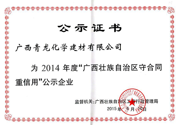 近年來,青龍公司始終秉承“一絲不句,精益求精”的企業(yè)精神和“用戶滿意,社會認同”的企業(yè)理念,在保障施工生產(chǎn)安全質(zhì)量的同時,高度重視企業(yè)信用工作。通過網(wǎng)上申報,經(jīng)市、區(qū)兩級工商局嚴格對資料審查程序和社會信譽調(diào)查及現(xiàn)場復查,公司最終從眾多申報企業(yè)中脫穎而出,榮獲2014年度廣西壯族自治區(qū)“守合同重信用企業(yè)”榮譽稱號,并在廣西紅盾網(wǎng)網(wǎng)進行通報表彰,充分展現(xiàn)了公司誠實守信的經(jīng)營理念,在廣西區(qū)建筑領(lǐng)域樹立了良好的企業(yè)信譽和社會形象, 為公司經(jīng)營投標增加了砝碼,進一步增強了公司的市場競爭力。