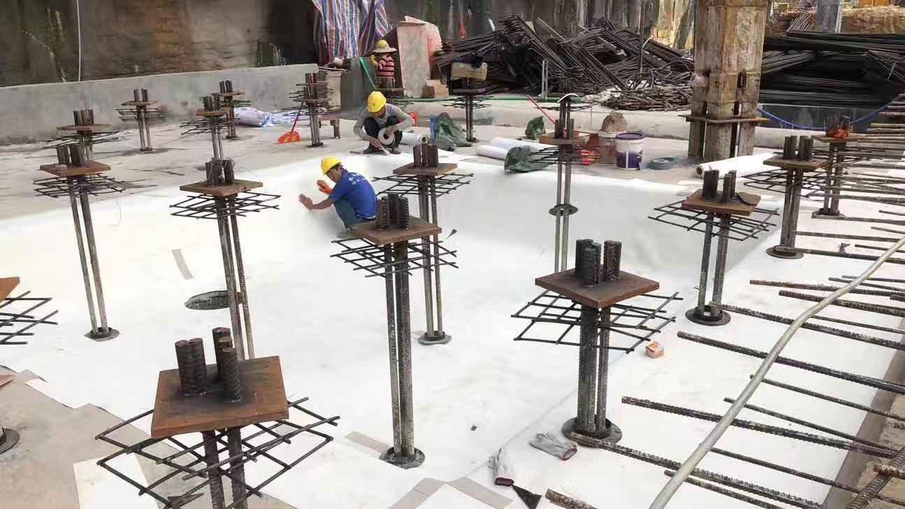 將地下室底板施工所用的1.2厚高分子預(yù)鋪防水卷材鋪貼于錨桿周圍表面,并與大面卷材緊密搭接,緊貼于錨桿鋼筋底部。