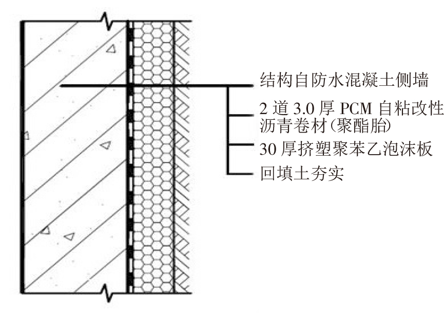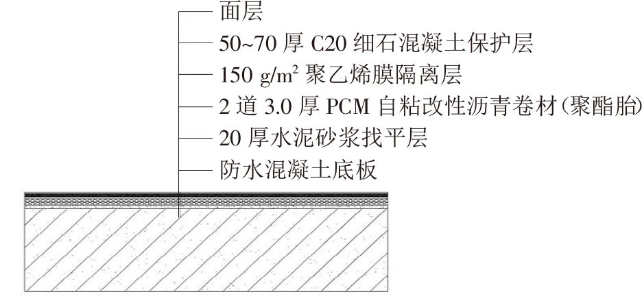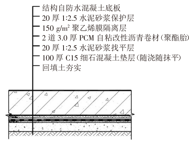 防水卷材選用本公司生產(chǎn)的3.0mm厚PCM自粘聚合物改性瀝青防水卷材(PY類)。該卷材是通過在樹脂和合成橡膠改性瀝青中加入少量活性成分,以聚酯胎作為胎體,以PE膜為表面材料,結(jié)合硅油隔離膜制備而成的防水卷材。該卷材具備較強的基層防竄水性能,卷材中的高分子材料可與基層粘接劑中的高分子和無機膠凝材料構(gòu)成界面互穿網(wǎng)絡,能有效避免防水層出現(xiàn)整體失效的情況。材料可冷施工,無火災隱患,不會污染環(huán)境,可直接在潮濕的基面上進行施工,基層無需做找平層,施工工藝便捷。另外,防水材料有較好的穩(wěn)定性、延伸性、耐腐蝕性和耐候性。