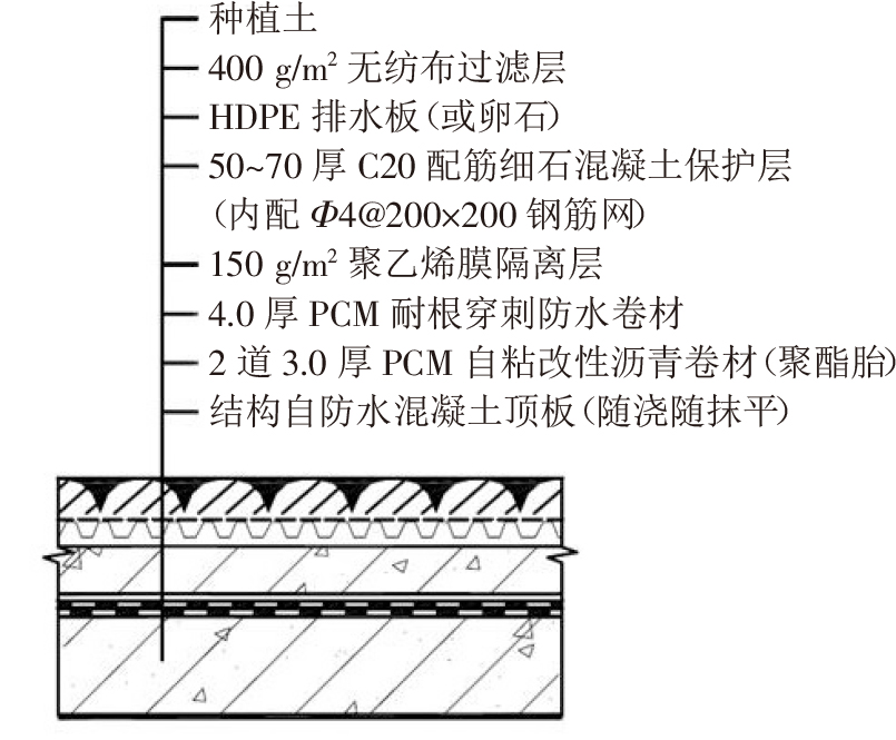 隔離層采用0.4mmPE膜,其主要作用為避免防水層與上方的細石混凝土保護層形成粘連,消除機械咬合力。過濾層采用單位面積質(zhì)量大于200g/m2的聚酯無紡布。種植土和植被層根據(jù)設計要求進行施工。