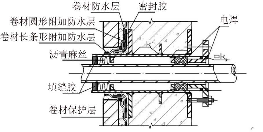 管道、線纜等存在更換需求,需用套管式防水設計,套管加焊止水環(huán)。套管與管道或線纜之間不得承受水壓,應在節(jié)點的外部設置集水井。室內(nèi)套管的一端應與外墻平齊,澆筑混凝土時端口預留的套管需密封,防止堵塞孔洞。室外套管突出外墻至少150mm,在外墻模板上定好預留穿墻管位置并開洞,外墻合模之前把套管放入模板洞中固定好,合模后再密封穿墻管與模板之間的間隙。管道與套管之間的間隙用柔性材料填充,保證端面光滑,同時管道的接口不得設置在套管內(nèi)。當?shù)叵滤惠^高時,需在套管周圍設緊固裝置來確??p隙的填充料密實和不發(fā)生位移(圖7)